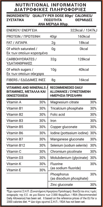 …το πιο ολοκληρωμένο και υγιεινό γεύμα με μόλις 332 θερμίδες, καθαρές, πλούσιο σε πρωτεΐνη 92,50%, με μόλις 0,0004 γραμμάρια λίπους ανά 500ml, χωρίς την προσθήκη ζάχαρης και γεμάτο φυτικές ίνες, βιταμίνες, μέταλλα, εκχυλίσματα φρούτων και βοτάνων σε απίθανη γεύση Ροδάκινο!